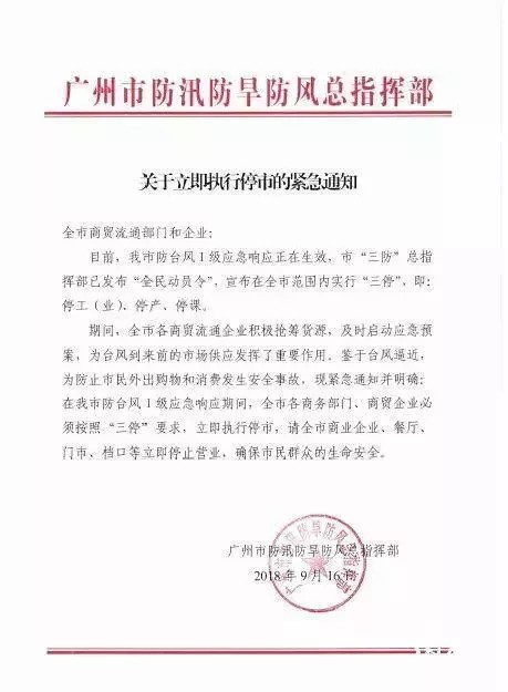 今天下午,根据市“三防”总指挥部的统一部署,决定从2018年9月16日中午12:00开始全市停市。全市商业企业、餐厅、门市、档口迅即遵照执行,坚决落实好停市要求,确保市民群众的生命安全。