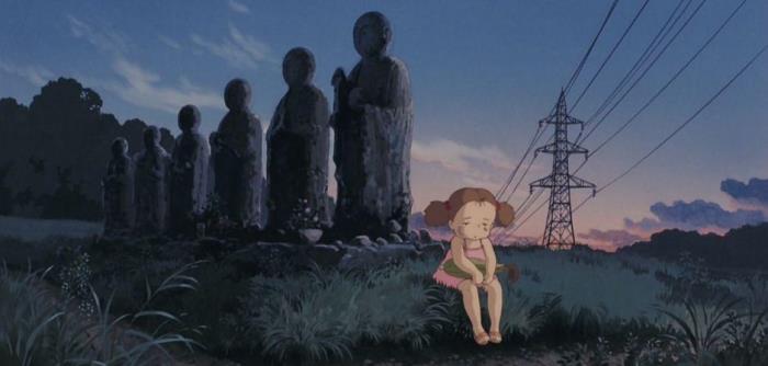 回到电影本身,在《龙猫》里有一个片段,小梅因为寻找母亲走失了,她坐在一排地藏菩萨边上哭泣。