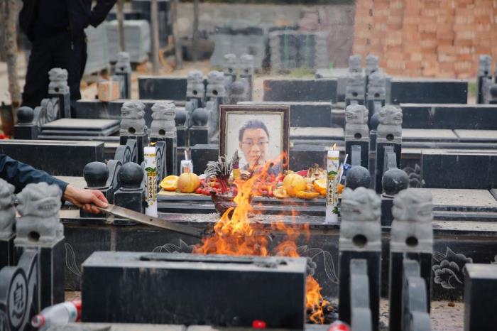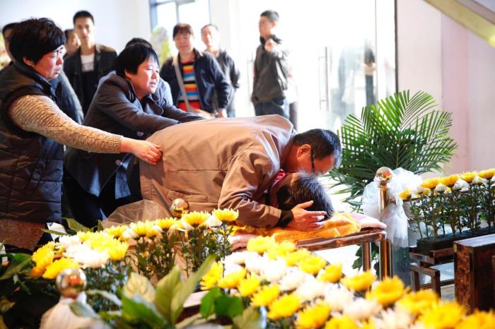 2016年4月13日,陕西咸阳。遗体告别仪式前,魏则西的父亲扑上去抱住他。魏则西生前以考上美国麻省理工学院为目标,学习努力刻苦,在同学老师中口碑很好。在患病期间,魏则西在网络上也以自己的亲生经历帮助患病咨询的网友,他生前不希望有病友再被“肿瘤生物免疫疗法”耽误救治。