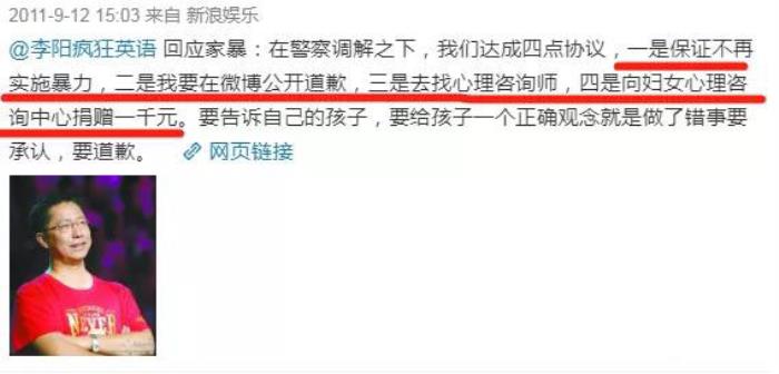 事发后李阳一直没有发声,直到一周后,他发声明称自己已与Kim达成了四条协议:不再暴力、公开道歉、接受心理咨询、向心理咨询中心捐赠1000元。