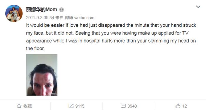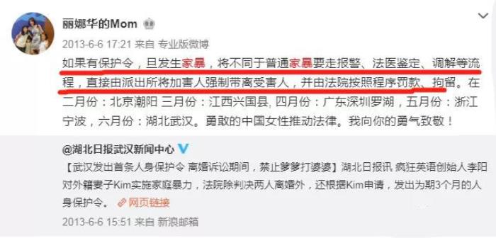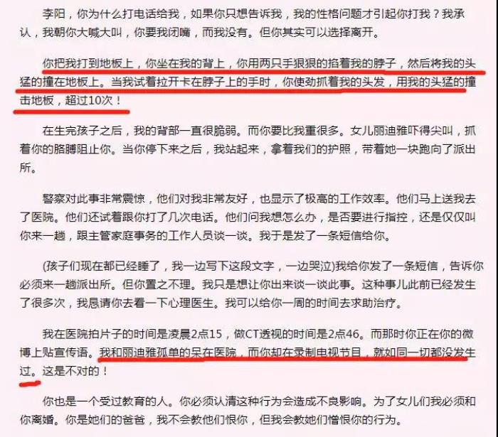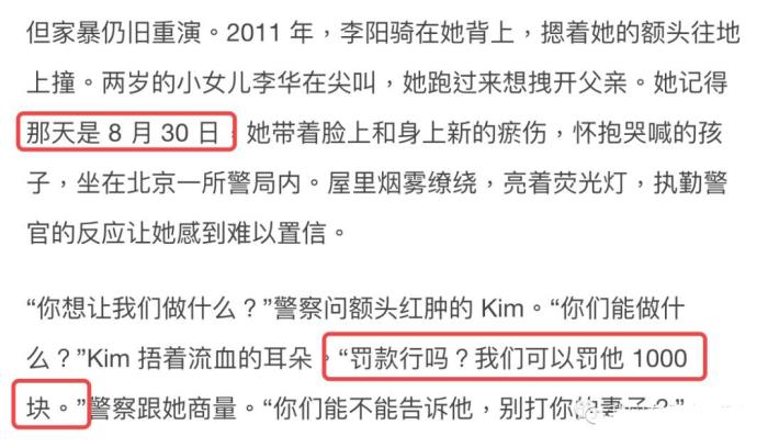 一石激起千层浪,当时已有诸多网友猜疑李阳家暴。直到9月,Kim连发10多条微博,讲述被李阳家暴的细节,诸如被李阳坐在背上,抓住自己的头猛烈撞击地板;被李阳掐脖子拽头发;一般都是当着女儿们的面动手……