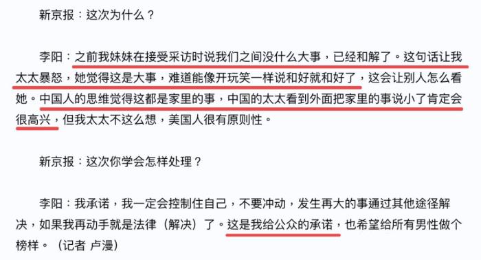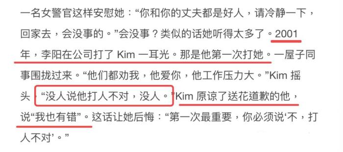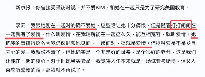 李阳还在访问中说自己和Kim在一起时并不爱她,把她当试验品;还说家暴这不算大事,中国太太看到外面把家里的事说小了肯定会很高兴。