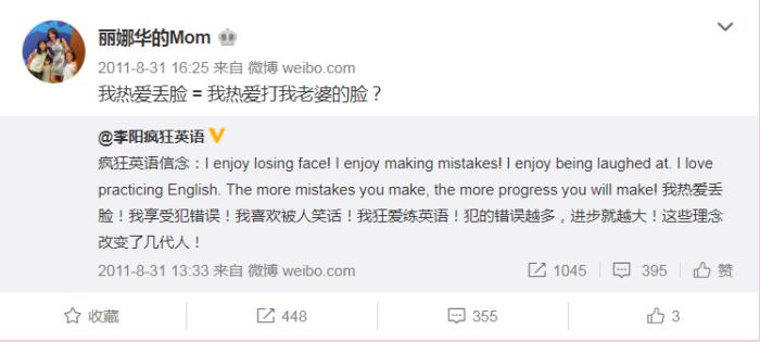2011年8月,Kim在自己的社交平台上讽刺李阳:热爱丢脸=热爱打老婆的脸?