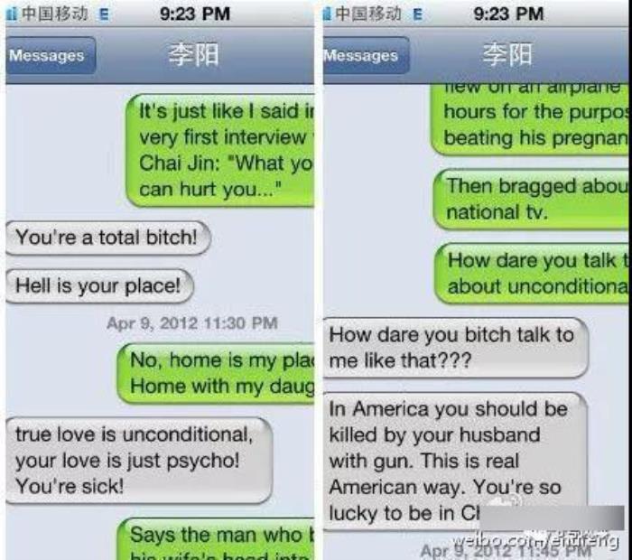 2011年10月,Kim正式提出离婚诉讼,她再次提供证据:李阳曾发短信辱骂Kim,内容如下↓