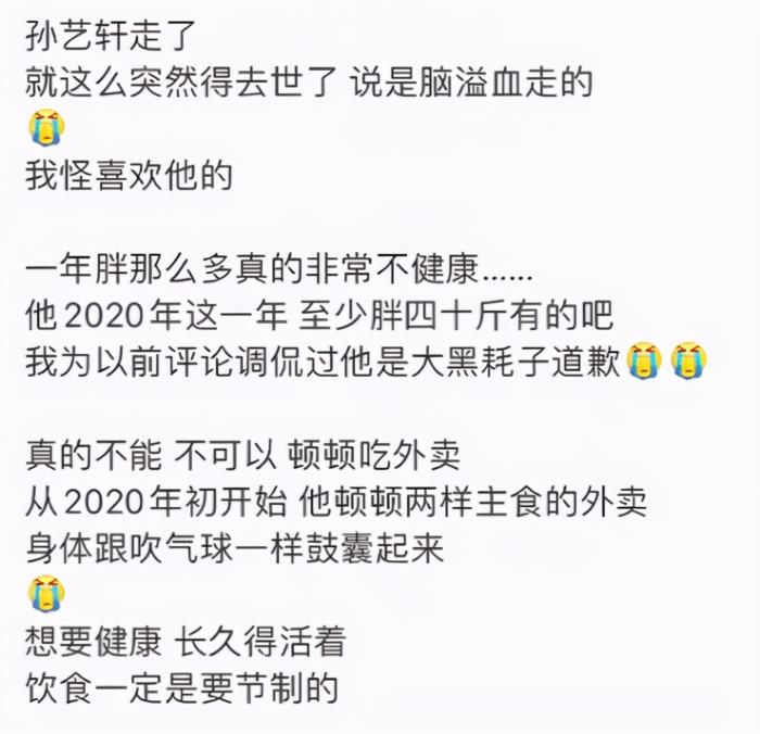就像某一位叫孙艺轩的网红,当了2年的吃播,让他从一个书生气十足的阳光少年变成了一个精神状态极差的油腻男人,后来永远地离开了大家。