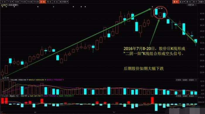 该技术形态由三根K线组合而成,其中第一根和第三根K线是中阴线,而第二根K线是阳线,由于此种K线组合形态有很多是在股价大幅上涨之后才构成的,因此,其短线下跌动力较大。
