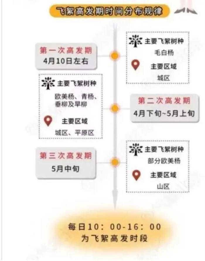 北京市园林绿化局、北京市气象局联合预报, 4月上旬,北京、天津、山东半岛、河北中部、山西南部等地将自南向北陆续迎来飞絮,北京预计在4月7日前后开始飘絮。一般上午10时至下午4时是飞絮的高发时段,过敏体质的人应尽量避开这个时间段外出,尽可能选择杨柳絮出现比较少的早晨、晚上或是雨后外出。