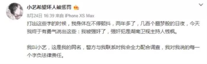出道多年来,钱枫的事业虽然没有大红大紫,但作为《天天向上》的常驻主持人也被不少观众所熟知。谁知这却是他的事业高峰,期间除去参加一些综艺节目,没有其他的曝光。2021年,突然有网友曝出两年前曾经受到过钱枫的强奸。