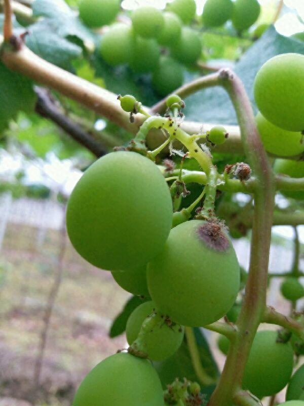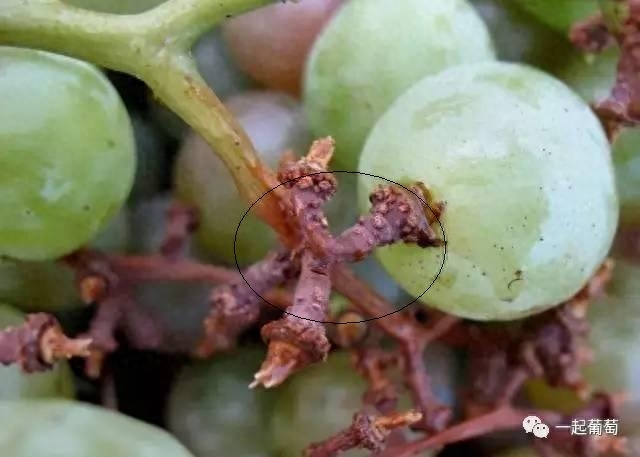 下图是溃疡,总在不经意间到来,果粒没事,果梗干枯。上果之前一定先侵染枝条,这时候要注意观察枝条,抑霉唑,金霉唑,辛菌胺,咪鲜胺都有不错的效果
