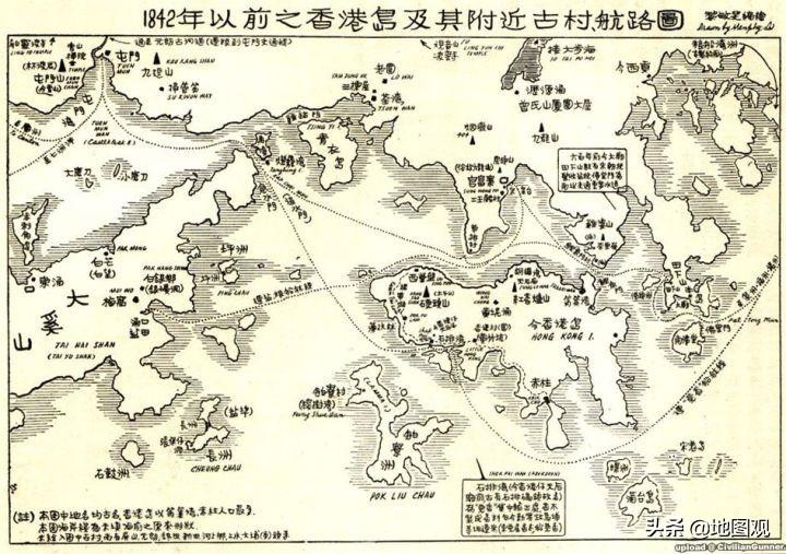 1842年:由黎敏斐编绘的开埠前香港附近古村丶航路图,可见当时香港岛与邻近地方的贸易关系。