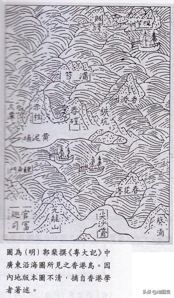 1595年:明朝郭棐撰《粤大记》,出现香港丶黄泥涌丶赤柱丶大潭丶九龙山丶官富巡司丶尖沙咀丶鲤鱼门丶葵涌等地名。作者:脱翁