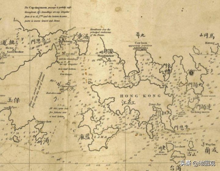 1834年:德国人绘制的广东省沿岸海图,在鸦片战争之前,Hong Kong(香港)丶Co Lun(九龙),Lamma(南丫岛)丶Lantau(大屿山)等地名已出现。