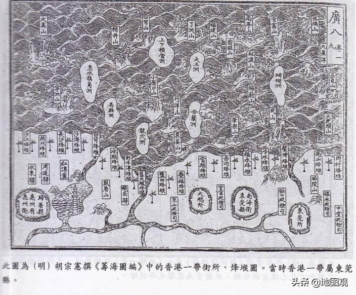 大明1554年:明朝抗倭名将胡宗宪着《筹海图编》中香港附近的卫所丶烽堠图,当时香港属东莞县,图中有官富山(观塘)丶梅蔚山(梅窝)丶笔架山(九龙)丶杯渡山(屯门)。