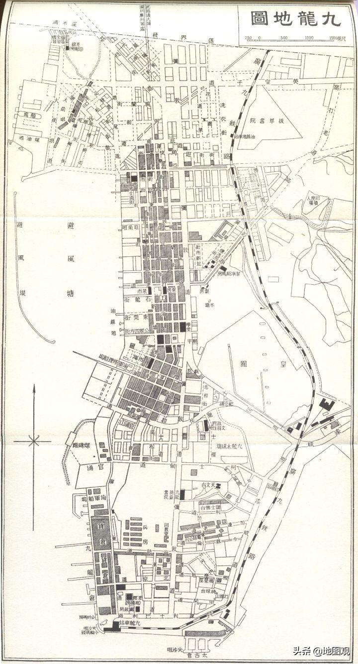 1915年:九广铁路於1910年通车,地图显示了路轨,另外还有黄埔船坞丶九龙寨城。