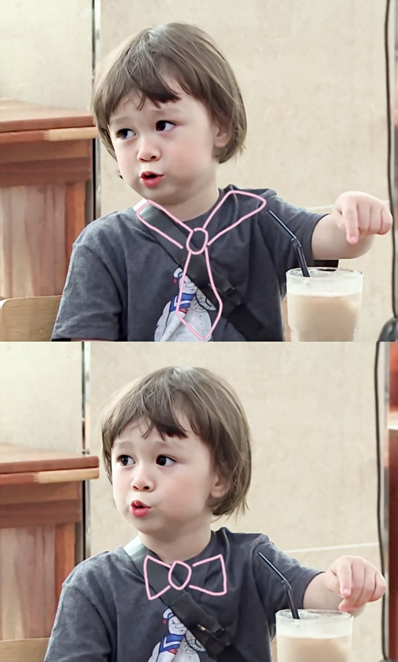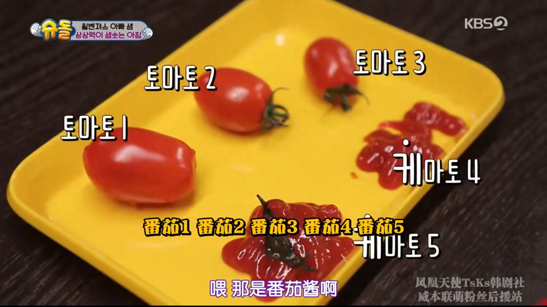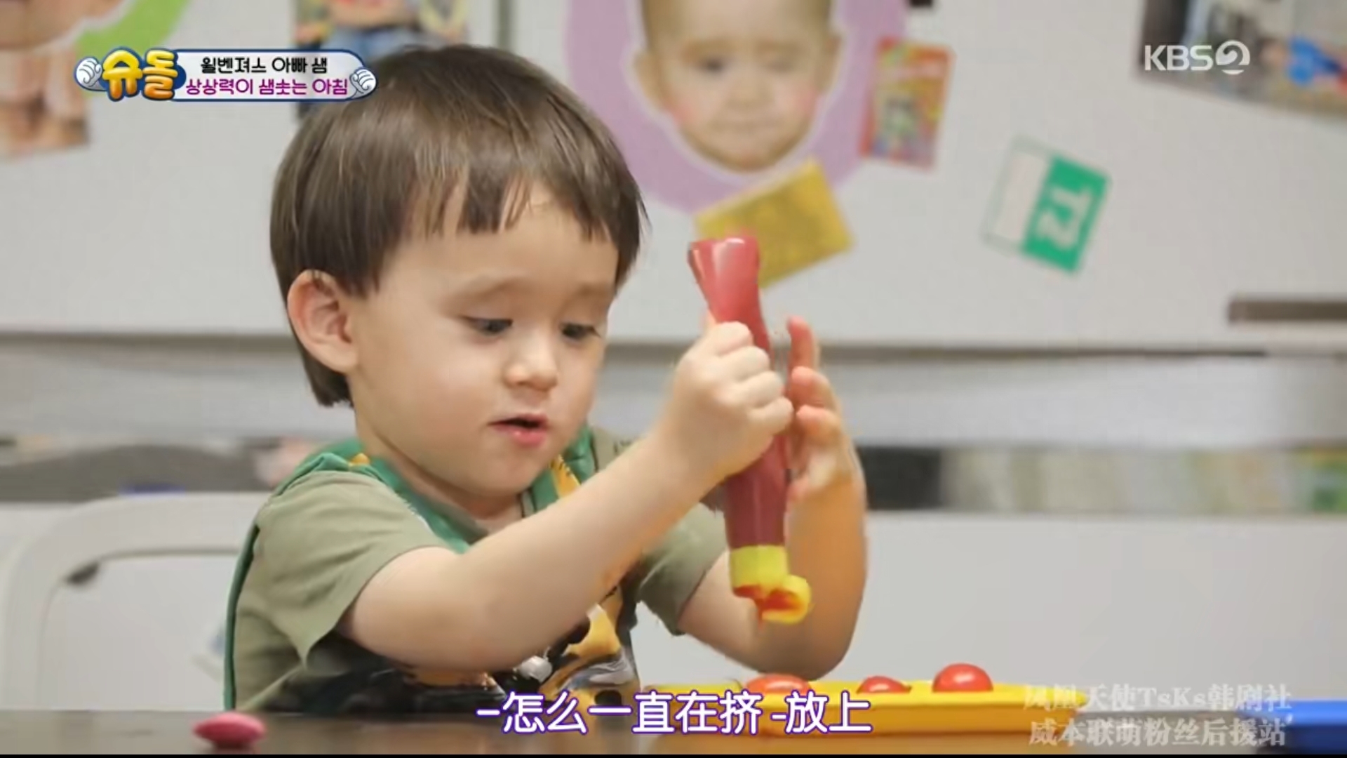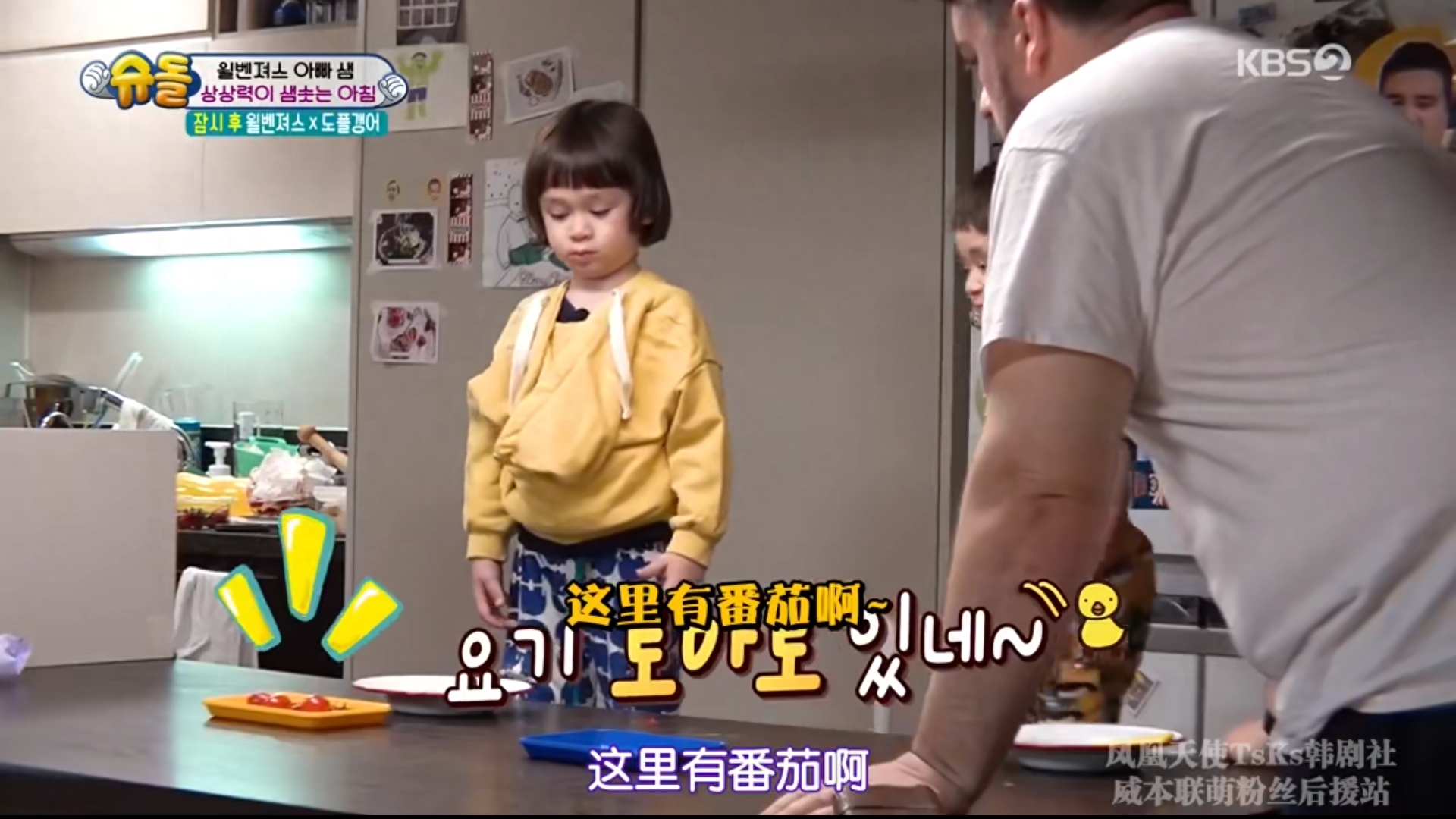 哥哥小威回来问本本,“我的番茄呢?”本用可爱的手指头指了指盘子里番茄形状的番茄酱,一脸无辜地看着哥哥,好像在说“这不就是吗?”。
