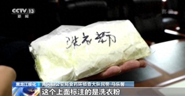 青冈县公安局食药环侦查大队民警 马乐馨:这个上面标注的是洗衣粉,为什么写洗衣粉呢?因为他自己知道,他将西布曲明原料灌在洗衣粉当中。